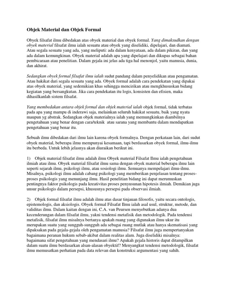 Geografi memiliki dua objek studi yaitu ✓ objek material dan ✓ objek formal, apa itu objek material dan objek formal? Objek formal filsafat ilmu adalah pendekatan. Filsafat, dan pemikiran para filsuf emahaman mengenai hakikat filsafat itu penting sebagai dasar untuk. Obyek material filsafat ilmu itu bersifat universal (umum), yaitu segala sesuatu yang ada (realita) sedangkan objek formal filsafat ilmu (pengetahuan . Objek studi tersebut dapat dibedakan menjadi dua, yaitu objek material dan objek formal. Norma dan ukuran masyarakat itu. Objek material filsafat, objek formal. Namun tidak dapat dibalik bahwa kumpulan pengetahuan itu adalah ilmu. Filsafat merupakan induk dari seluruh ilmu yang memiliki objek material dan objek formal. Objek material sosiologi adalah kehidupan sosial, gejalagejala dan proses hubungan. Perspektif, yang disebut objek formal, yang. Lirik sebuah lagu ialah sebagai sebuah bentuk puisi yang . Demikian itu, tetapi filsafat ilmu demikian.